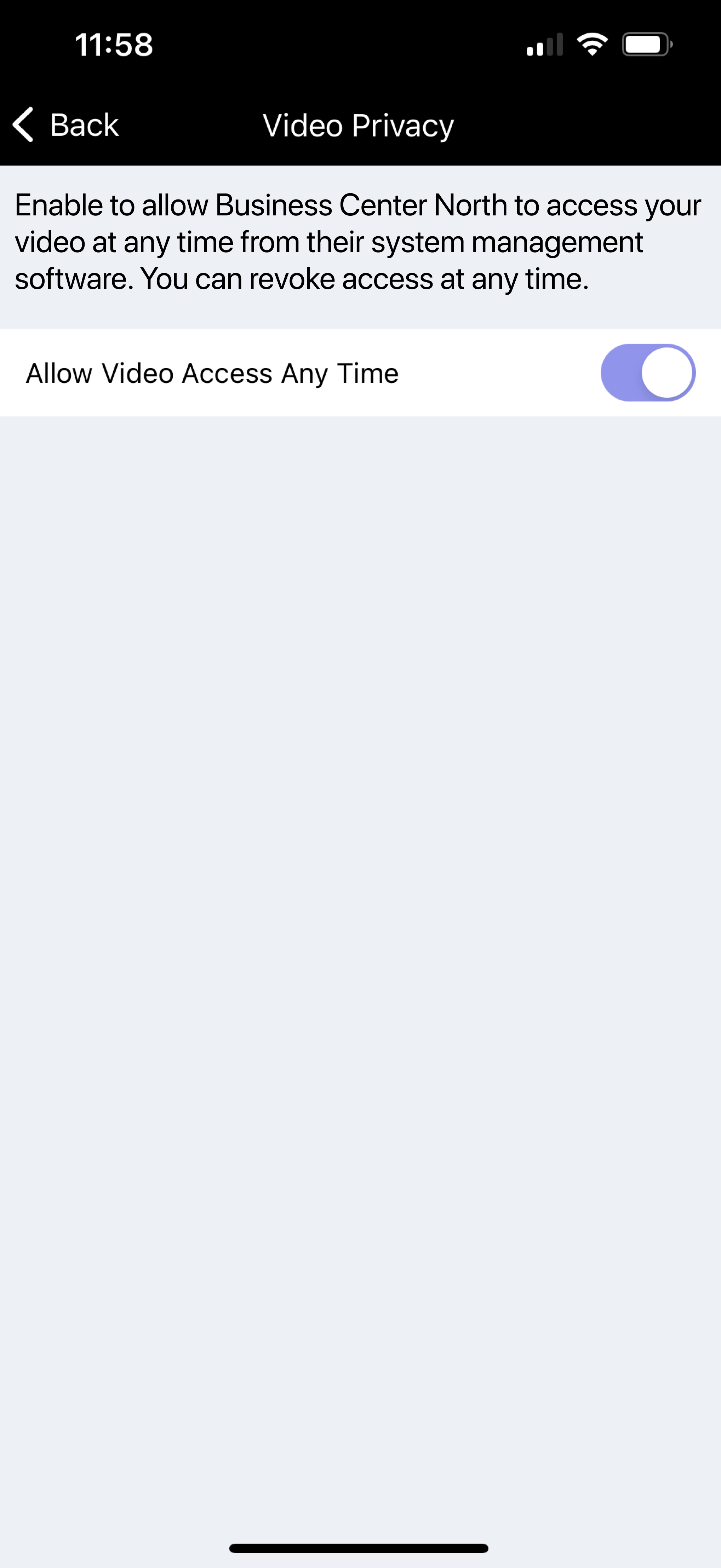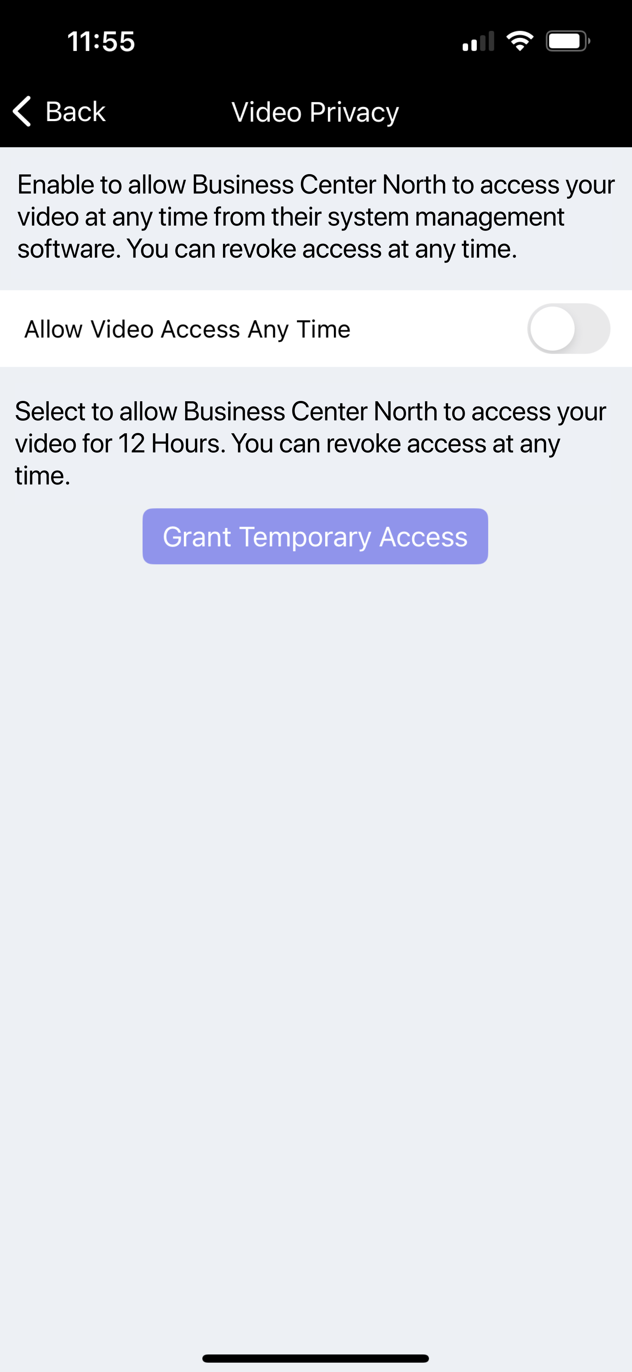 Enable Allow Video Access Any Time to grant technicians and dealers unlimited access to the video feed. If Allow Video Access Any Time is disabled, you can select Grant Temporary Access to allow technicians and dealers access to video for 12 hours. Access can be revoked instantly by selecting Revoke Access or disabling All Video Access Any Time.
