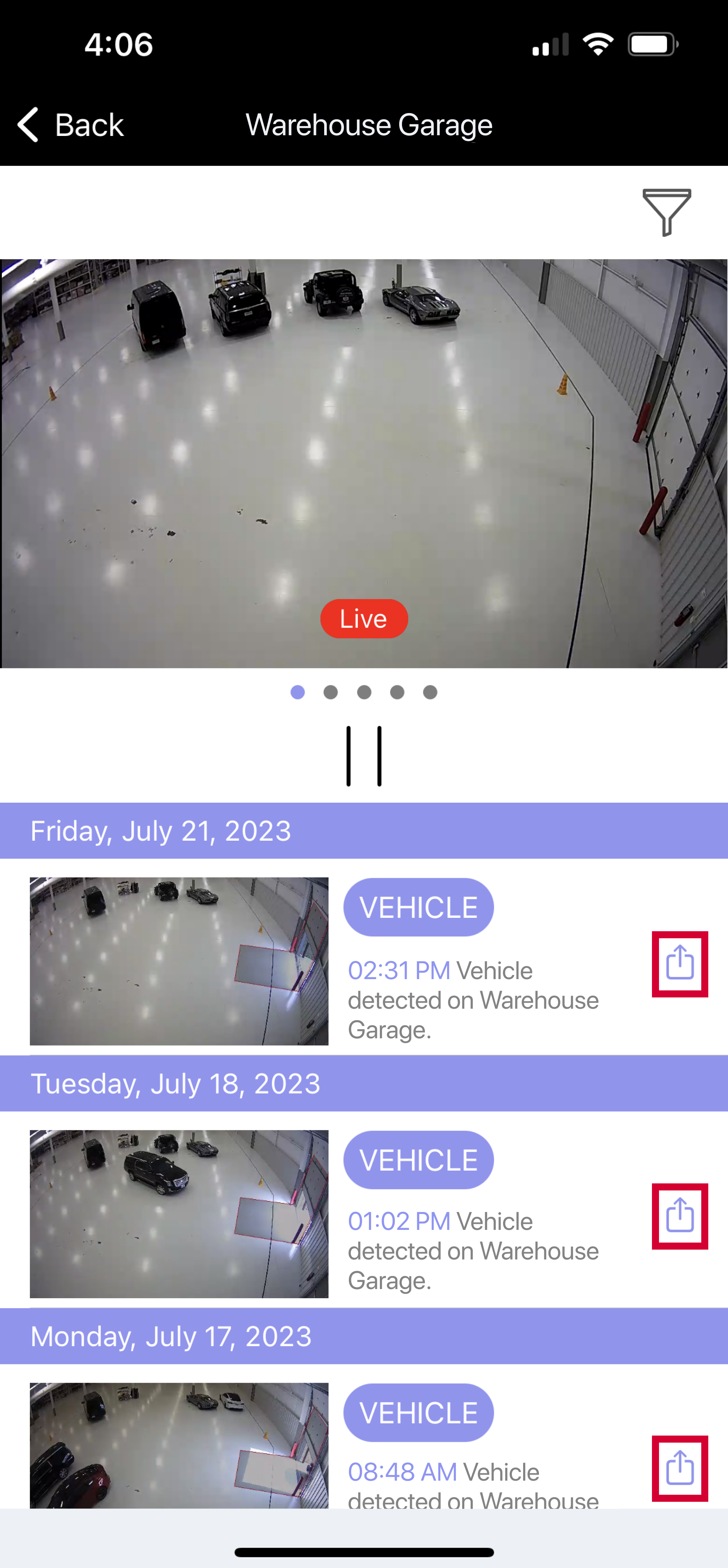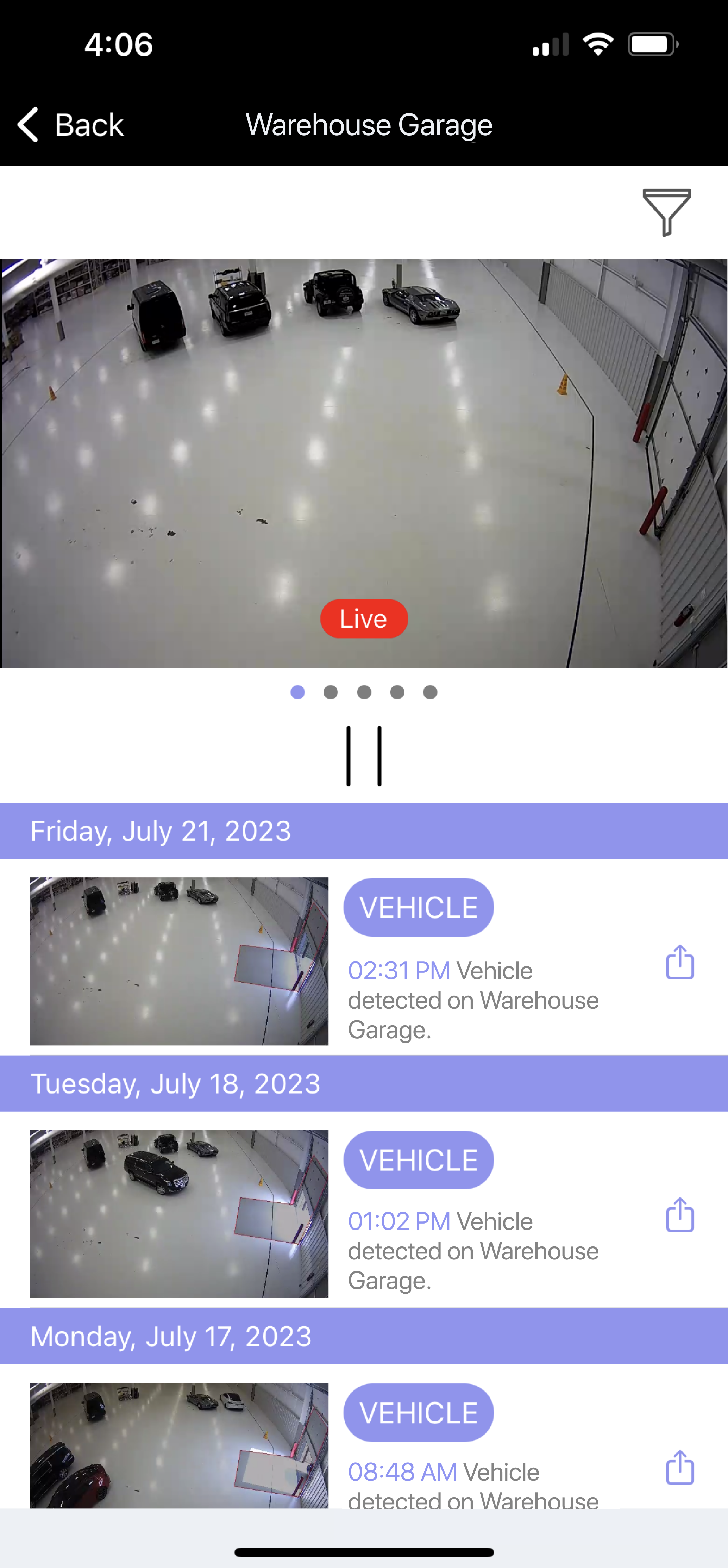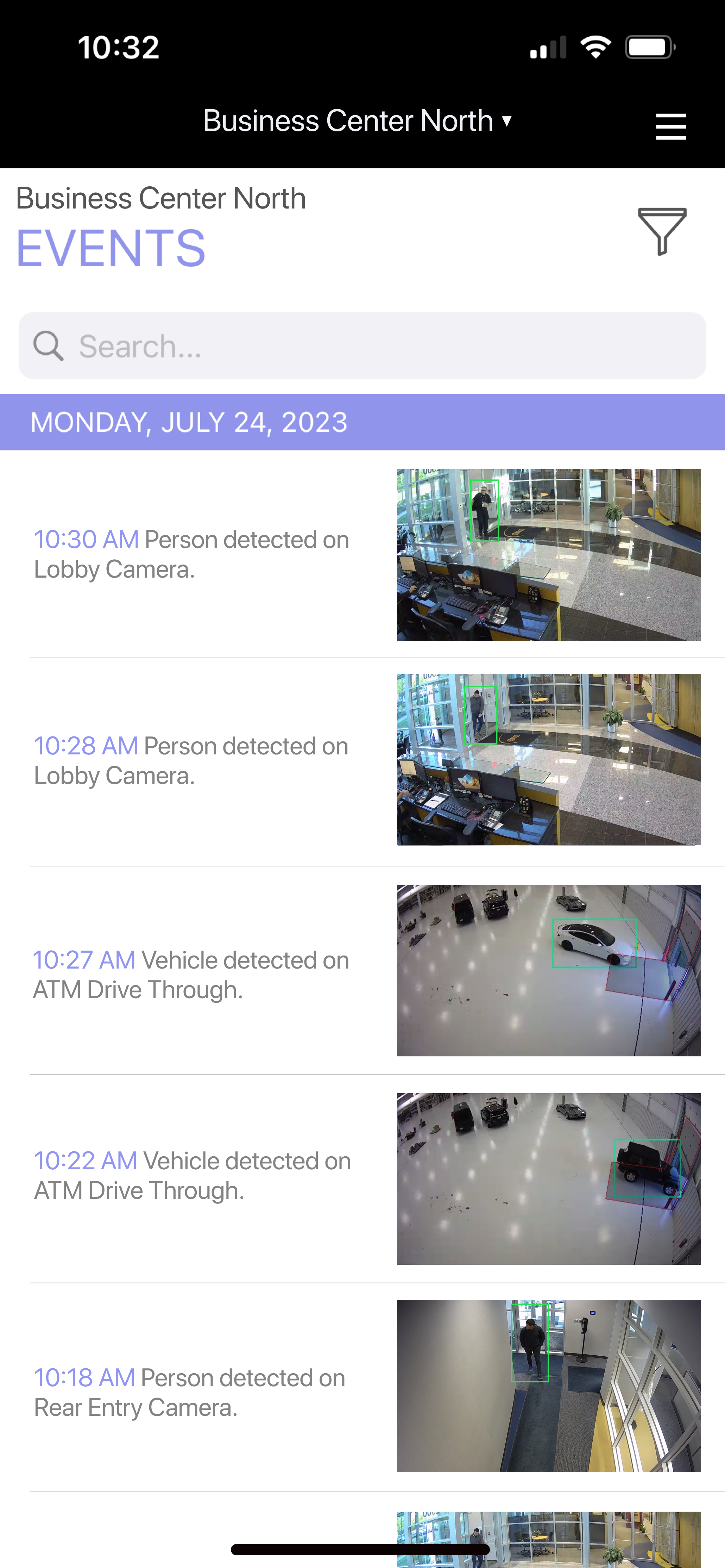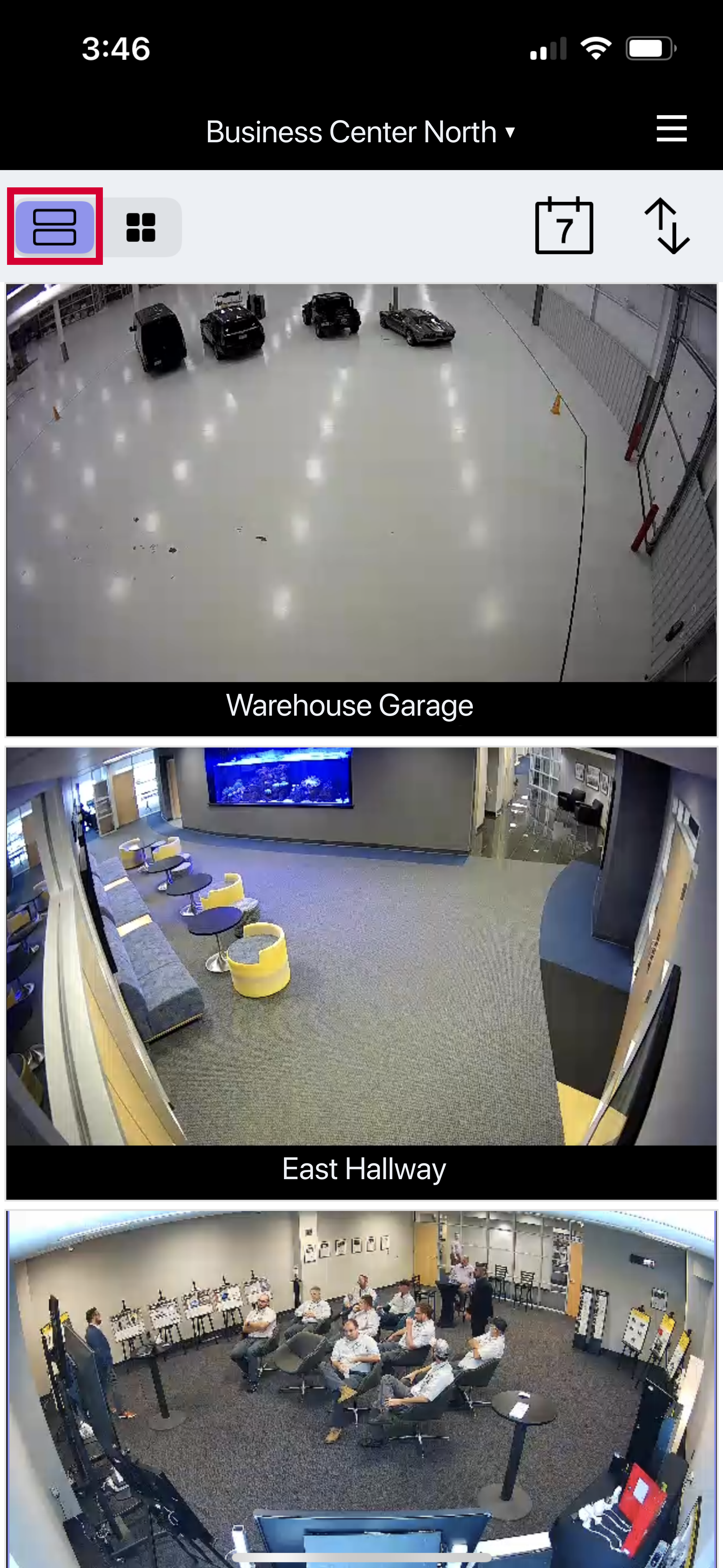Use this view to see live video clips from multiple cameras in a list format. Scroll down to see more cameras.