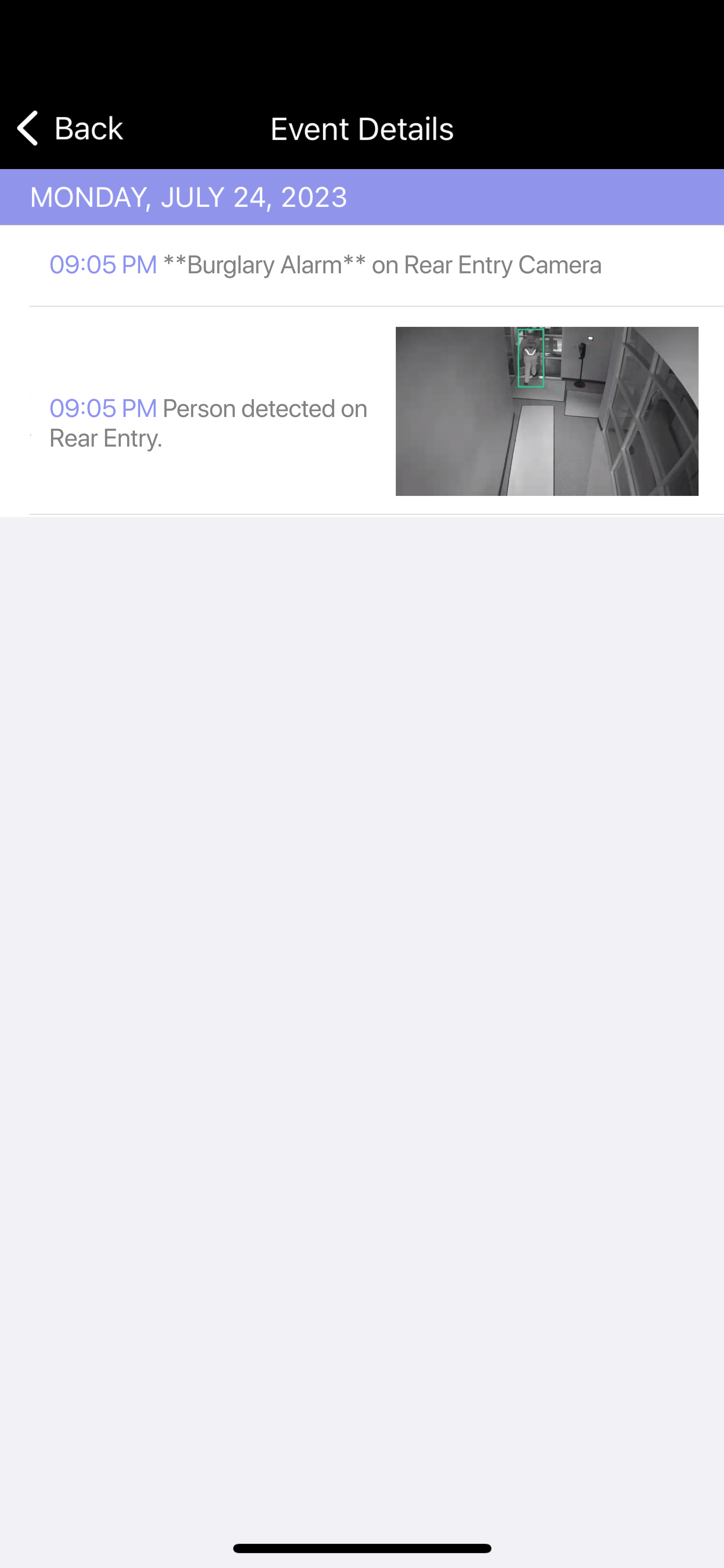 If a person enters the alarm zone detection region when the system is armed, the system will go into alarm and the camera will record the clip to populate in Events. The user will get a verification notification if they have Alarms set as a push notification. If a person enters the alarm zone detection region while the system is unarmed, no event will be recorded.