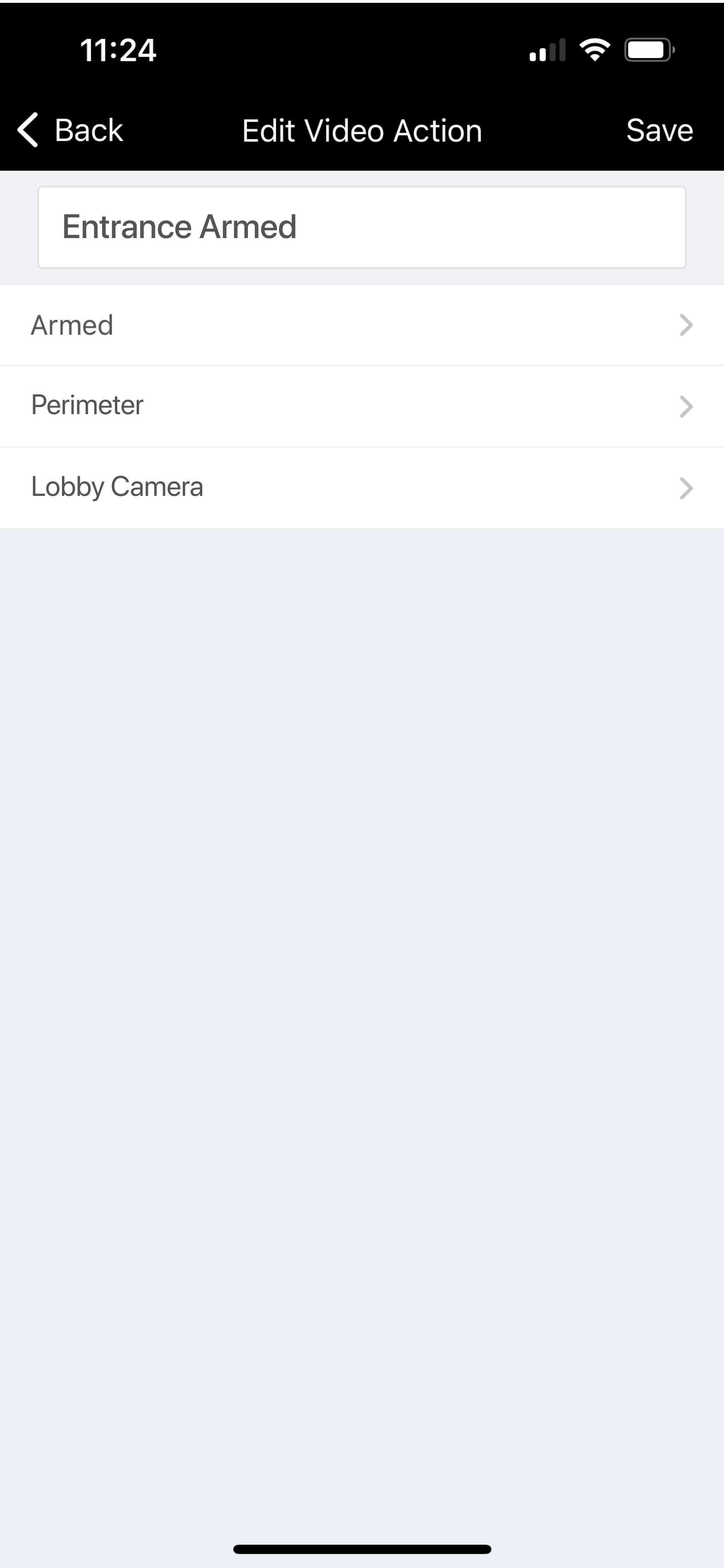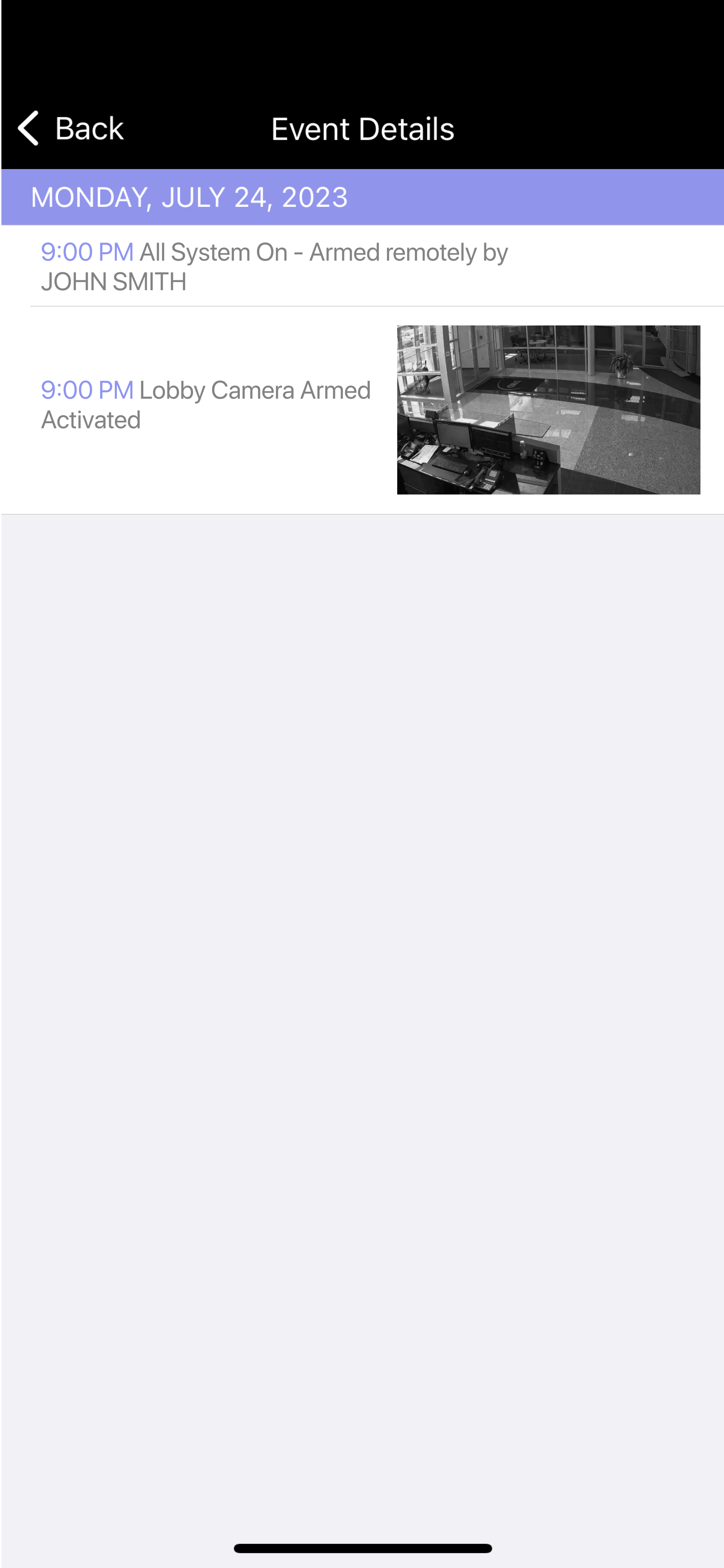 Tap Event Type. Select one of the following event types: Alarm, Armed, Disarmed, Door Propped, Zone Bypass, Access Granted, or Access Denied.