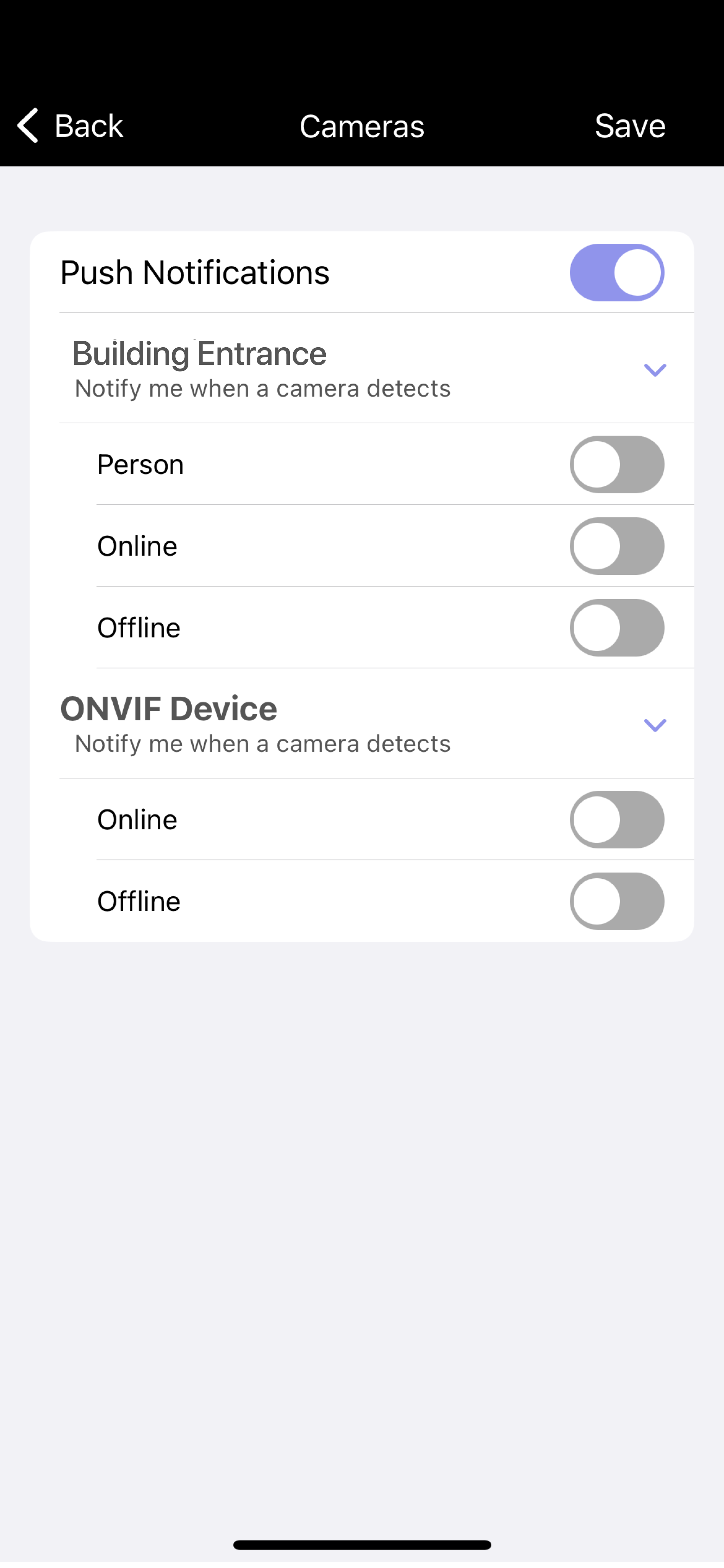 Tap the toggle for camera detections you want to be notified for. Options include Person, Vehicle, Online, Offline. Users will receive a push notification any time the camera is set to detect, as defined in Dealer Admin.